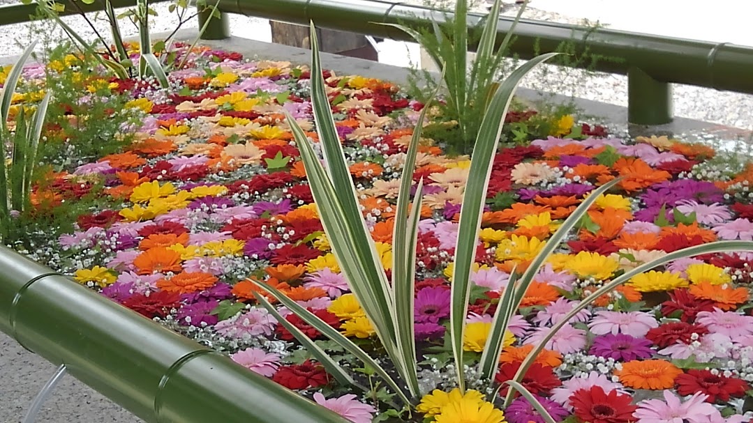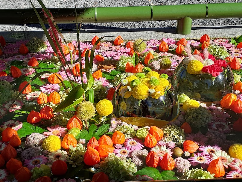 In recent years, many of the Shinto shrines perform HANATEMIZU that the colorful flowers are displayed over the water of the basin.